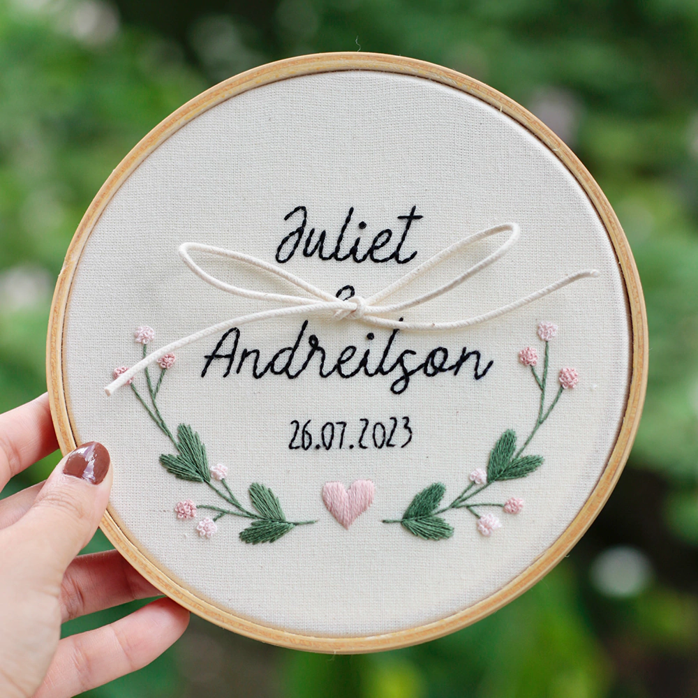 O porta aliança bordado a mão personalizado será feito com o nome enviado pelo cliente em tecido de algodão cru e bastidor de madeira sem ajuste, com mesma fonte e cores dos modelos da foto do produto.